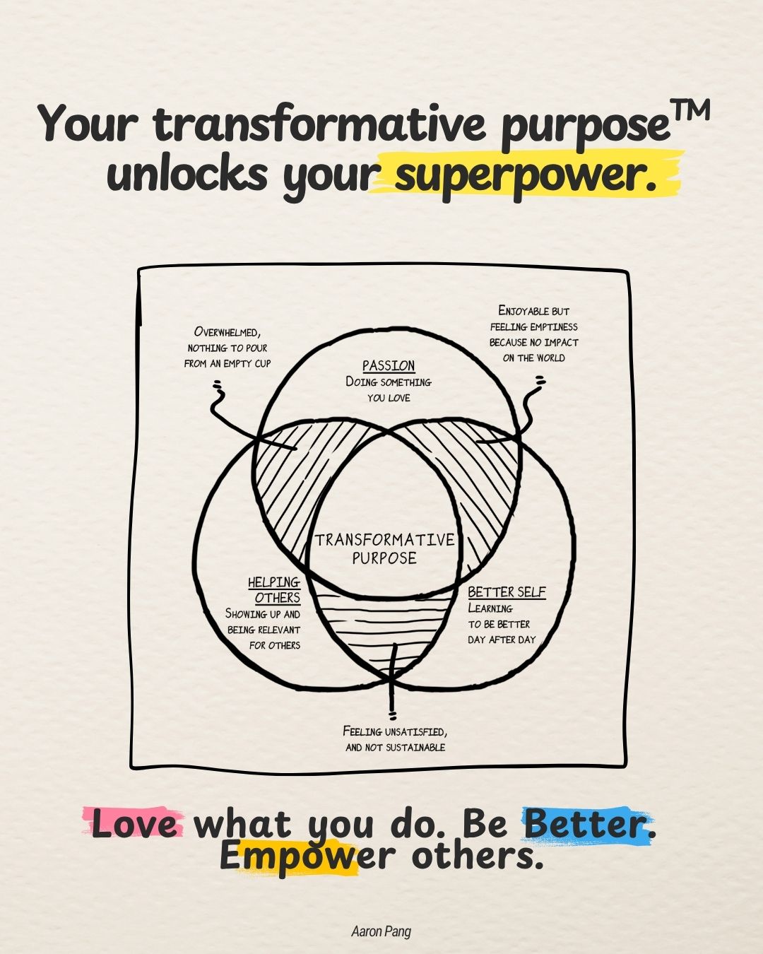 We embrace the Transformative Purpose Model as a guiding framework to empower leaders. Developed by award-winning author Aaron Pang, this model highlights three foundational elements of purpose-driven leadership: